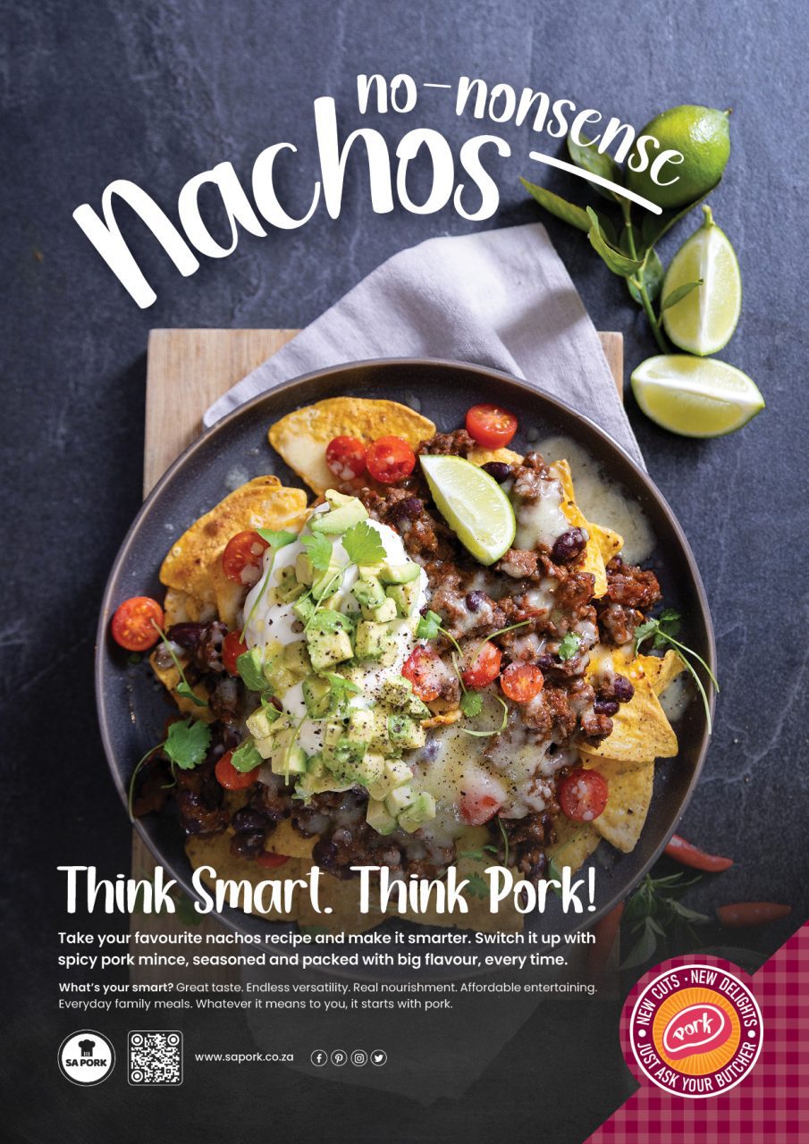 Crispy corn chips loaded with deliciously spicy minced pork and red kidney beans, cheese, salsa, avocado and sour cream. A real crowd pleaser. Brown minced pork with onion and garlic in a little olive oil. Add fresh chilli, Worcestershire sauce, smoked paprika and season with salt and pepper. Sauté for 5 minutes before adding tomato paste, chopped tomatoes, meat stock and drained red kidney beans. Simmer slowly until thick and flavourful while you prepare the other elements and assemble the nachos before it goes under a red-hot grill.