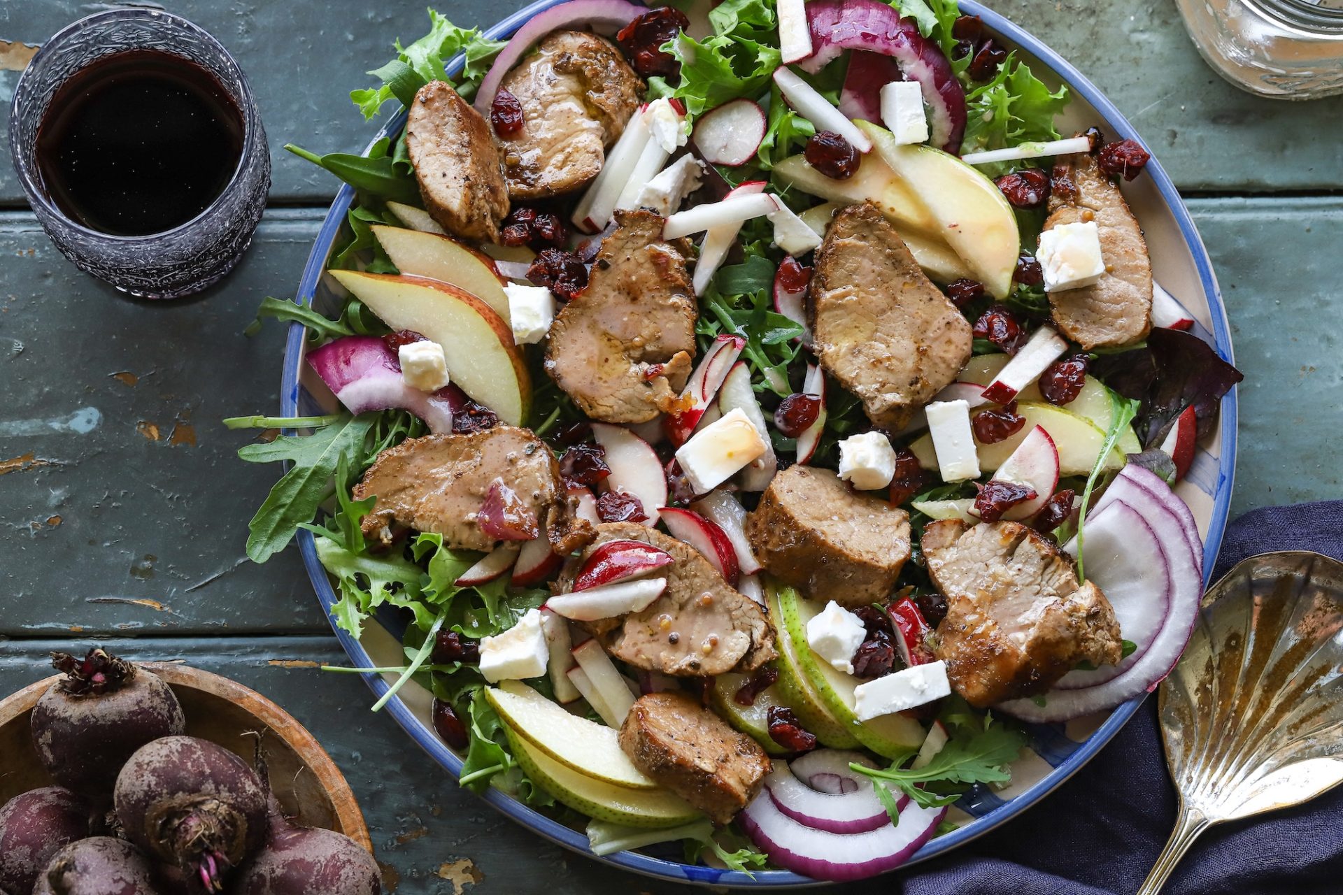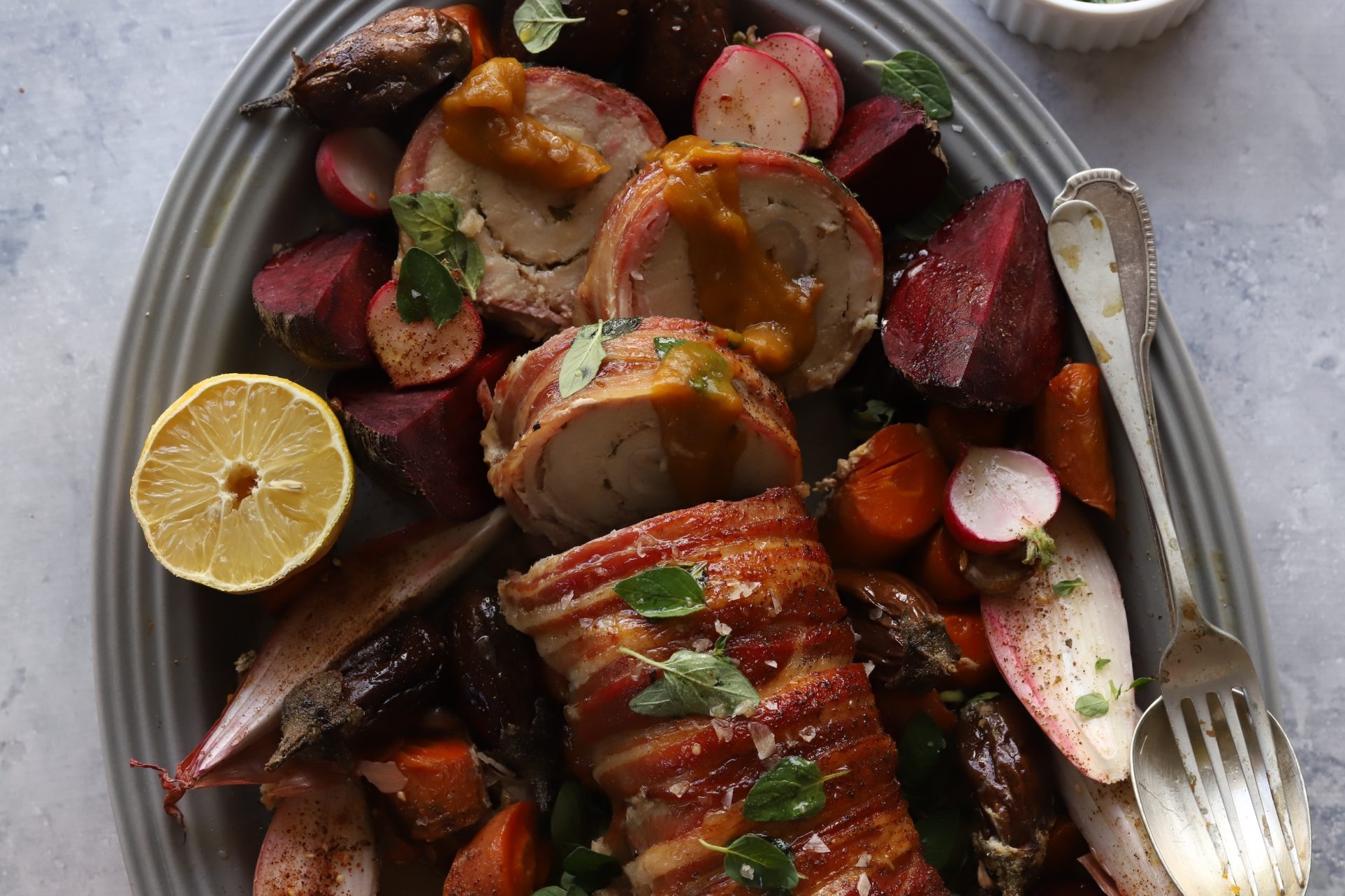 Prepare the porchetta: Butterfly the pork loin by cutting it lengthwise and opening it flat like a book. Cover with plastic wrap and gently pound to an even thickness. Mix the garlic, rosemary, sage, thyme, fennel seeds, lemon zest, salt, and black pepper together. Rub the herb mixture generously over both sides of the pork. Lay the streaky bacon slices slightly overlapping on a large sheet of baking paper, forming a rectangle large enough to wrap around the pork. Place the seasoned pork loin at one end of the bacon and roll it up tightly into a cylinder, using the baking paper to help guide the roll so that the bacon wraps neatly around the outside. Tie the roll securely with kitchen string at 3 cm intervals. Refrigerate overnight, uncovered, to allow the exterior to dry out slightly.